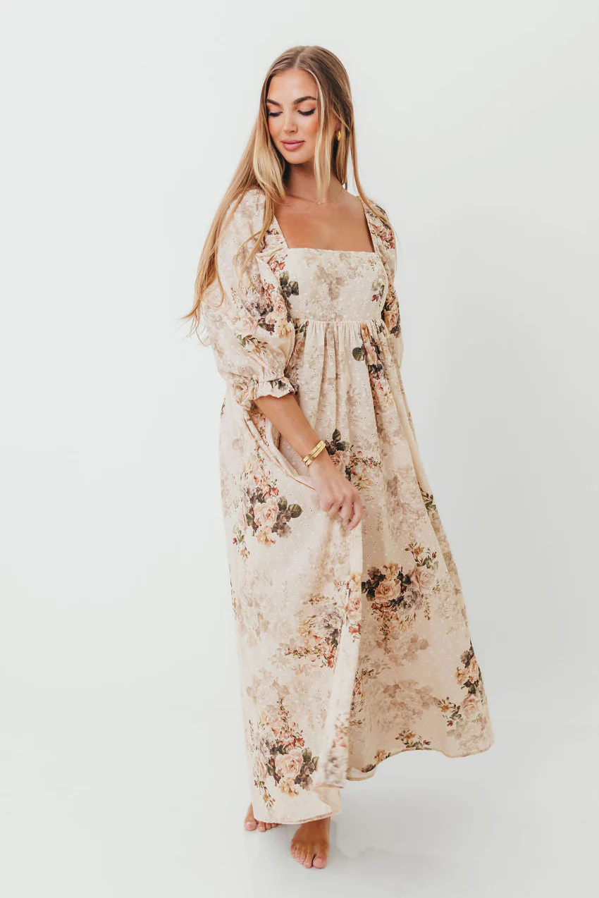 Mona Maxi Dress with Smocking in Cream/Beige Floral - Bump Friendly