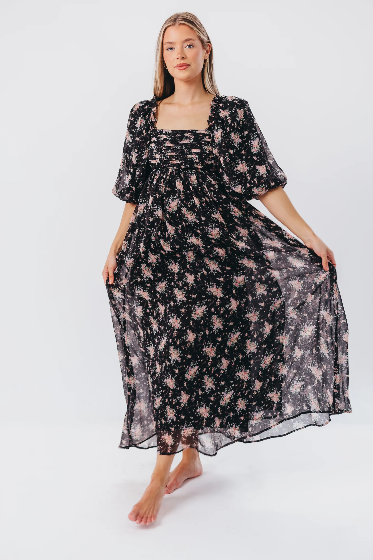 GARMENT DETAILS: Maxi dress with empire waist silhouette, square neckline, and pleated bodice with smocked back panel. Finished with 1/2 length balloon sleeves that can be worn on or off the shoulder, and a low, dramatic back with self-tie bow detail.