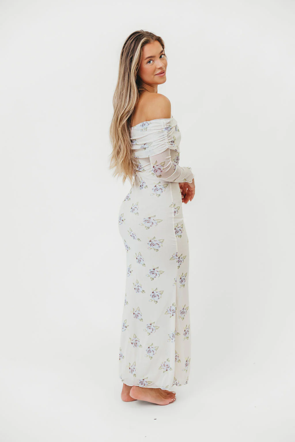 GARMENT DETAILS: Gorgeous floral-print maxi dress with off-the-shoulder neckline and mesh overlay, with sheer long sleeves. Fully lined.