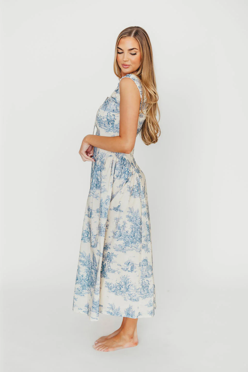 GARMENT DETAILS: Feminine 100% cotton midi dress in a classic toile print, with a scooped neckline and front tie detail. Features a shirred gusset on the sides, with a hidden back zipper. Fully lined.Â