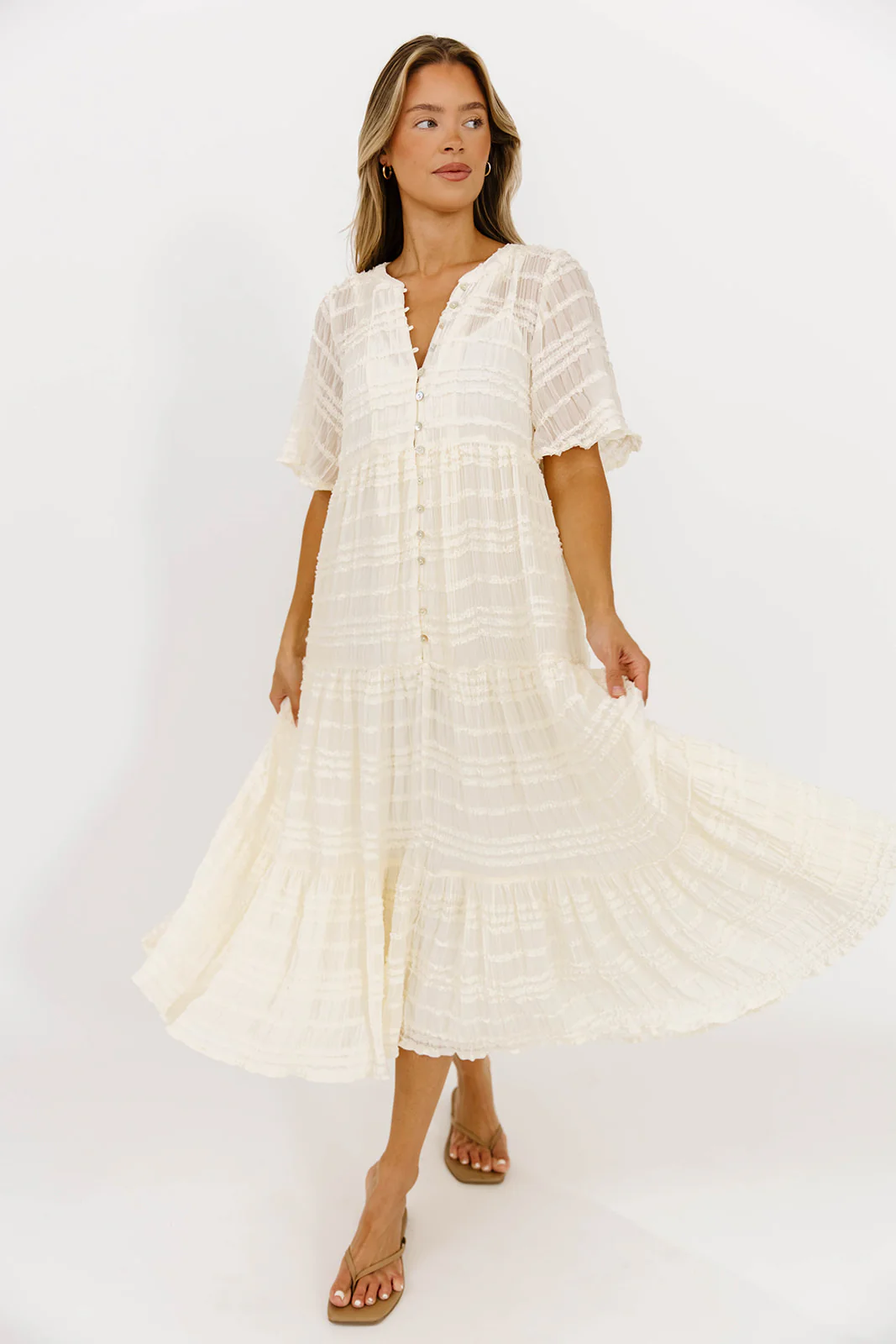 GARMENT DETAILS: Feminine, textured maxi dress with an elegant, relaxed silhouette. Features 1/2 length sleeves, functional front button placket, and multi-tiered design that provides comfort and movement. Fully lined with detachable liner.